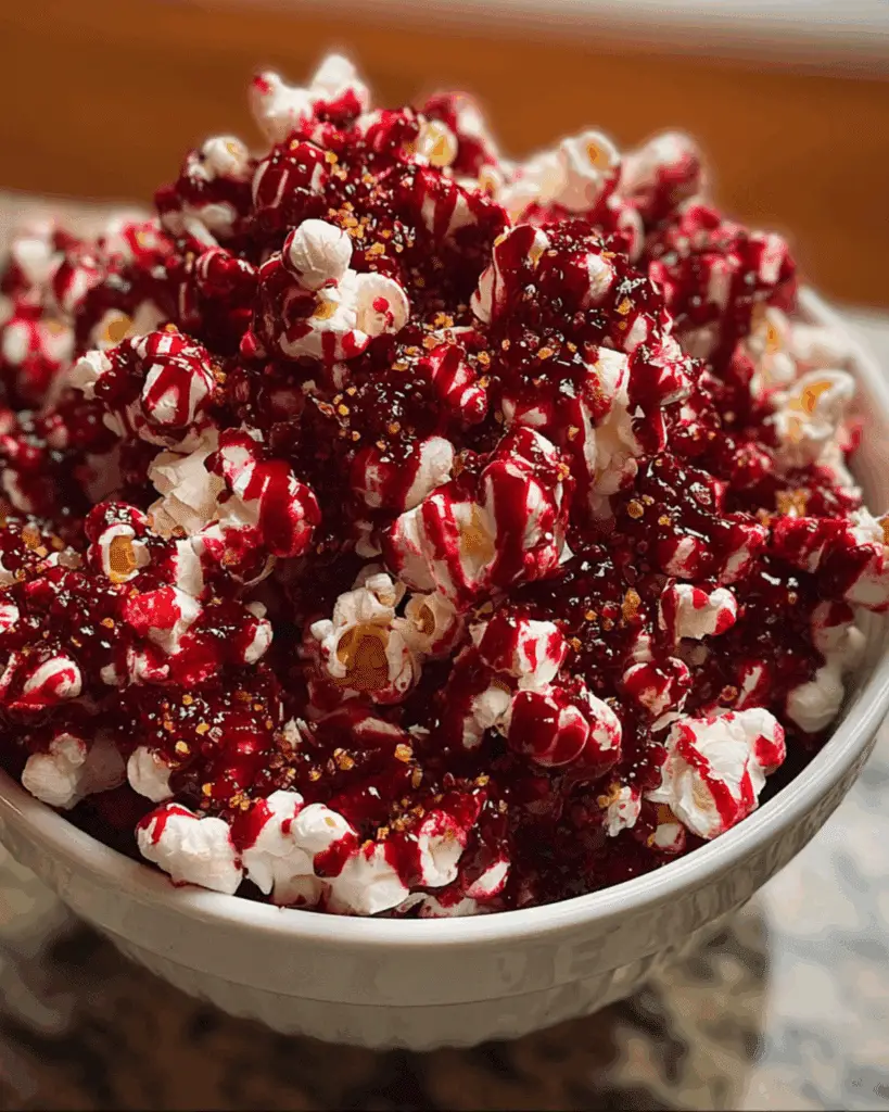 Bloody Red Velvet Popcorn is a spooky, sweet Halloween treat made with popcorn coated in red velvet-flavored white chocolate and topped with a bloody red glaze. Perfect for parties, movie nights, or creepy gift bags.