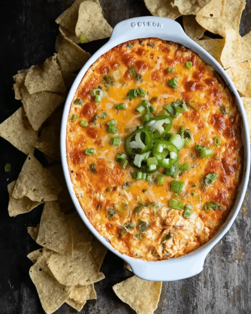 Buffalo Chicken Dip is a creamy, cheesy, spicy appetizer made with shredded chicken, ranch dressing, cream cheese, hot sauce, and a mix of cheeses. Perfect for game day or parties.