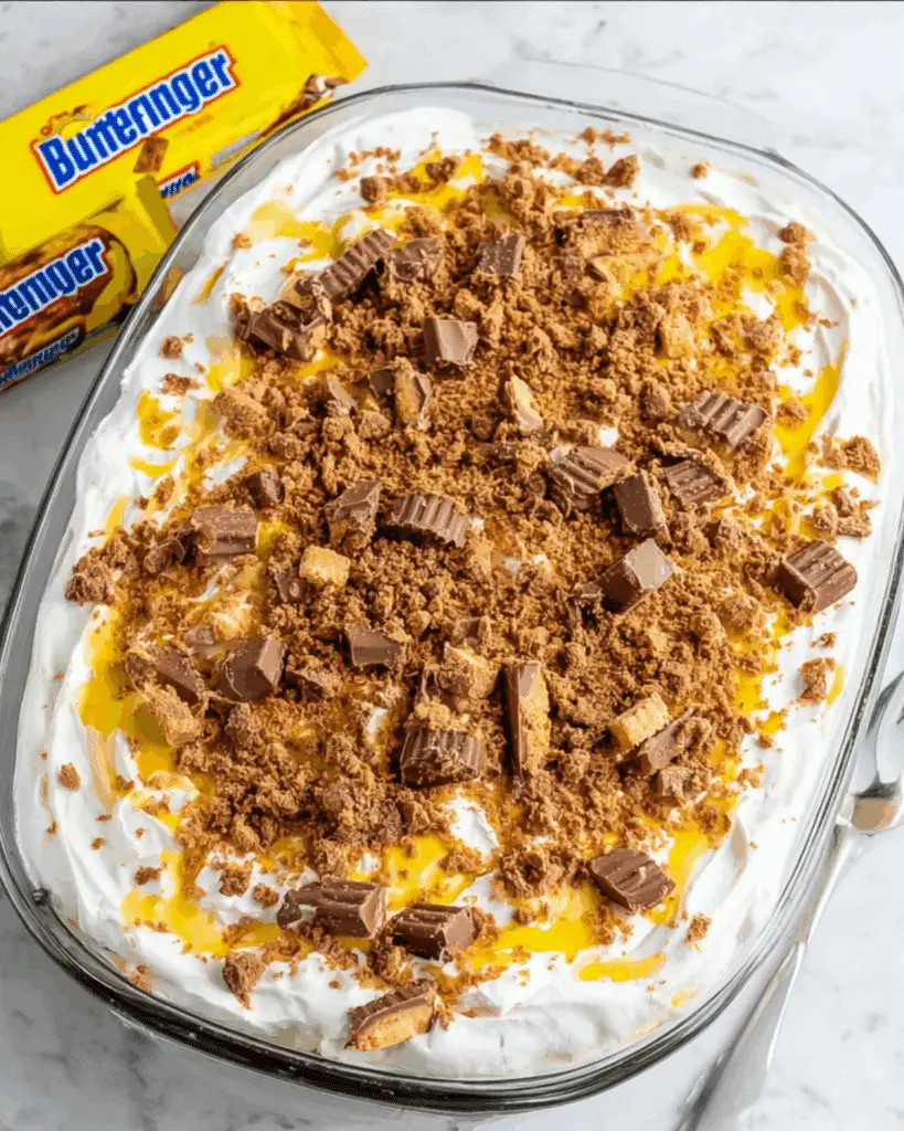 Spread the remaining 2 cups of whipped topping across the pudding layer. Finish by sprinkling the chopped mini Butterfingers generously over the top. The more, the better!