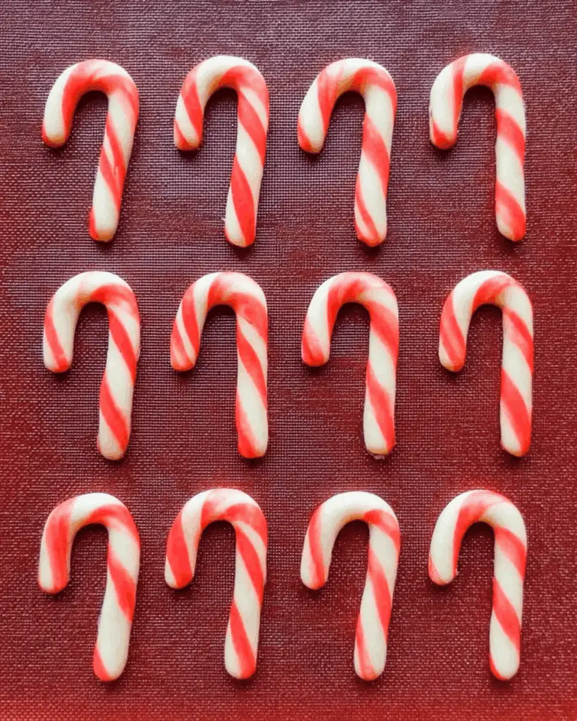 - Roll 1-inch balls from each dough and stretch into 5-inch ropes. Twist one red and one white rope together and shape into a candy cane.