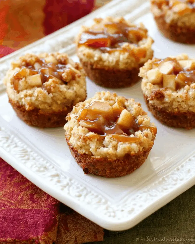 Spray a muffin tin with cooking spray—skip the paper liners, as the caramel will stick. Drop about two tablespoons of blondie batter into each cup, smoothing it slightly. Add a spoonful of cinnamon apples on top, then drizzle a teaspoon of caramel sauce over the apples, keeping it away from the tin’s edges to prevent sticking. Finally, sprinkle each cup with a crumble made from butter, flour, and brown sugar for added texture.