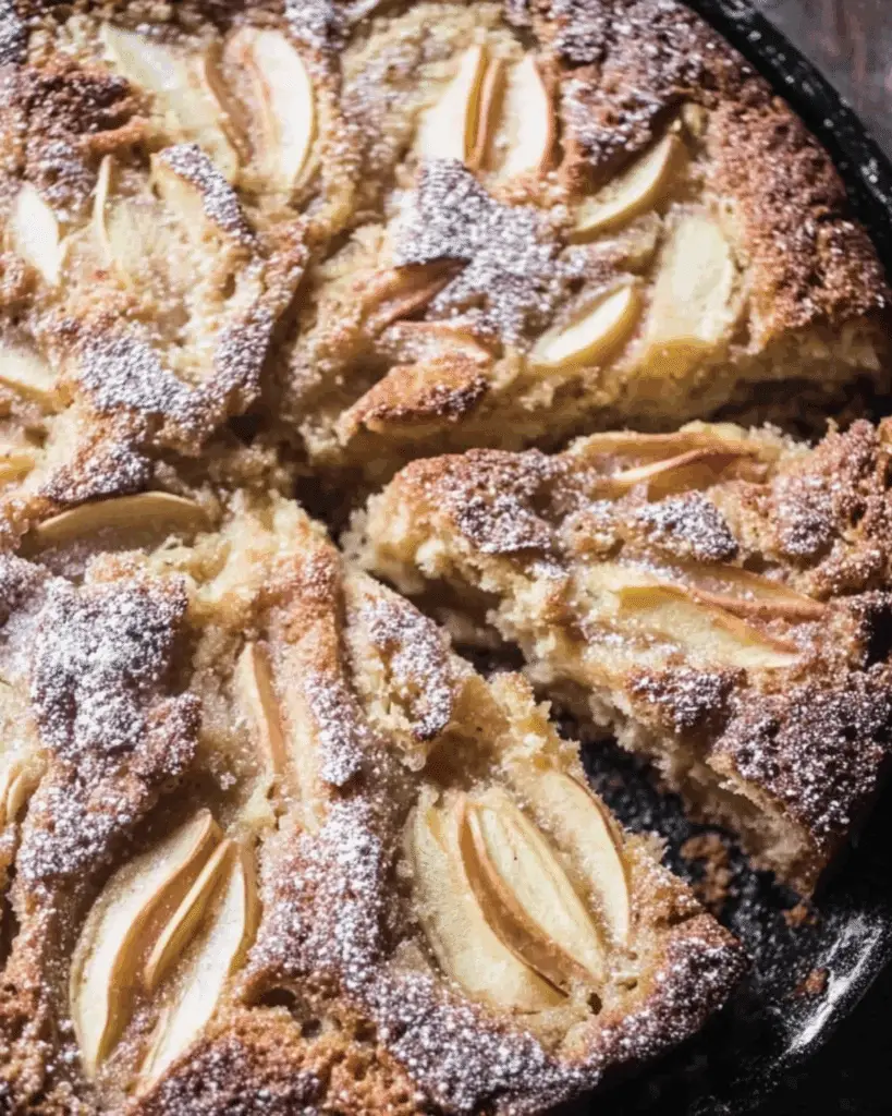Pour the batter into your skillet and top with the reserved apple slices in a circular pattern. Sprinkle turbinado sugar on top for a caramelized crunch. Bake for 55–65 minutes or until a tester comes out clean. Let it cool for 5 minutes in the pan before dusting with confectioners’ sugar.