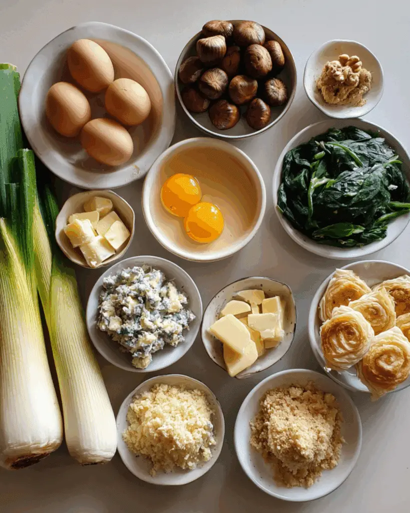 Start by sautéing leeks and garlic in melted butter until soft—about 10 minutes with a lid on to trap moisture. Set this mixture aside. In the same pan, wilt the baby spinach until it reduces down significantly. Once cooled, gently squeeze out all excess water with your hands or a clean towel. This step is crucial to prevent a soggy filling.
