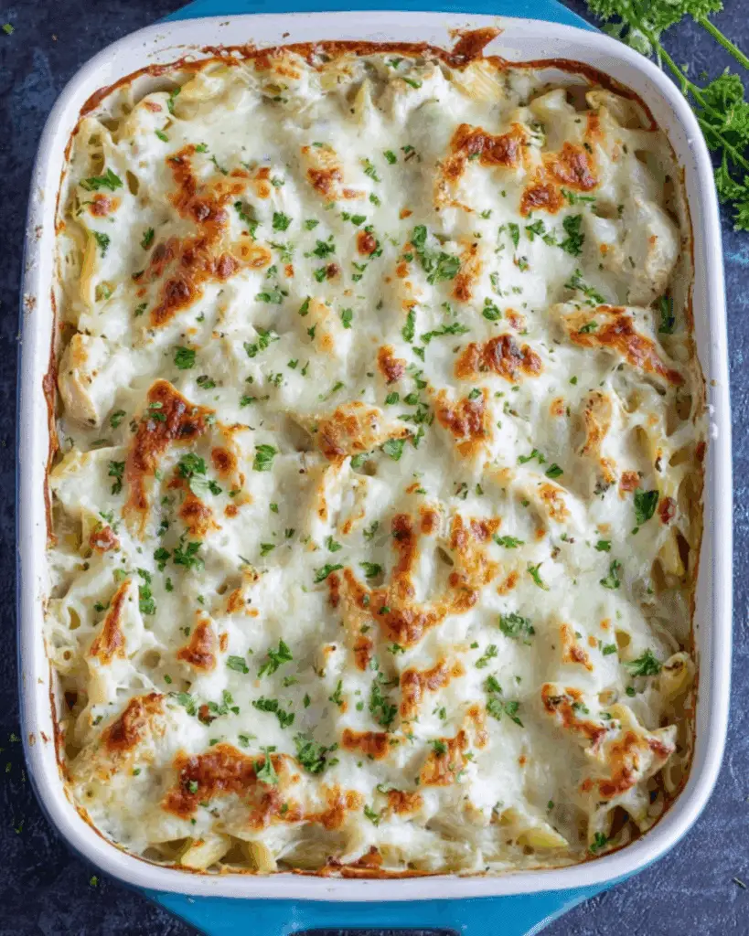 This Chicken Alfredo Bake is the ultimate comfort food—creamy, cheesy, and packed with tender chicken and pasta, all baked to golden perfection for an easy weeknight dinner.