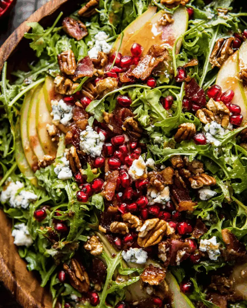 The dressing blends Dijon mustard, honey, and either balsamic or apple cider vinegar. A hint of orange juice and zest brings festive brightness, while a pinch of chili flakes adds a subtle kick. It’s a balanced mix of sweet, tangy, and savory that complements every component of the salad.