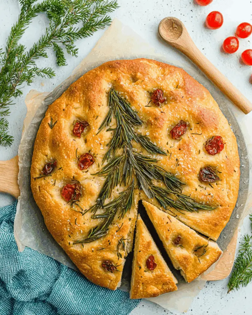 A festive no-knead Christmas Tree Focaccia decorated with rosemary sprigs, cherry tomatoes, and colorful vegetables — perfect as an edible holiday centerpiece.