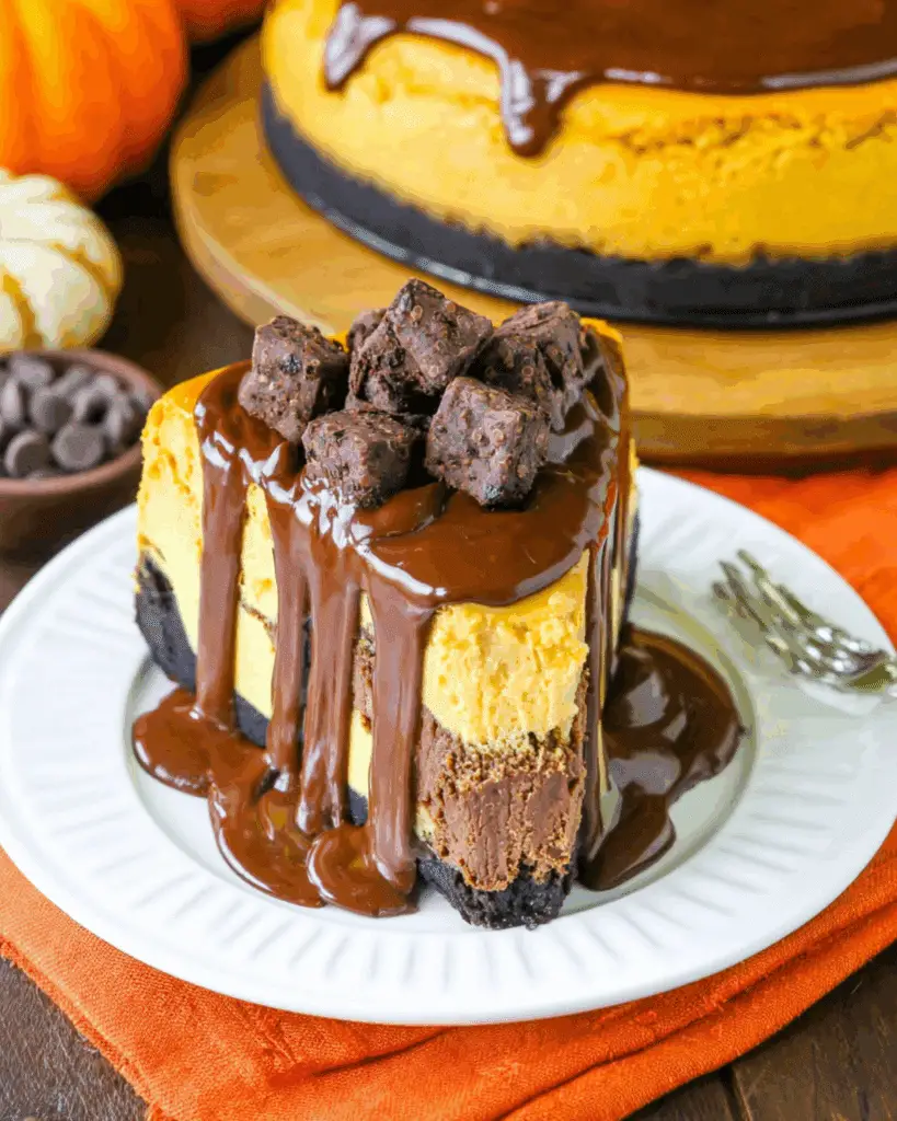 A decadent fall dessert featuring creamy pumpkin-spiced cheesecake with fudgy brownie chunks on an Oreo crust, combining the rich flavors of chocolate and pumpkin spice.