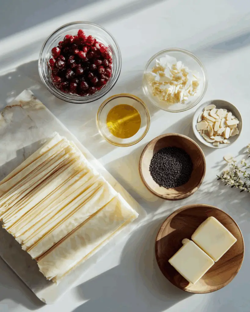Slice the brie into slim strips and set out your cranberry sauce, nuts, and melted butter. A clean, dry surface will help you work efficiently without tearing the pastry.