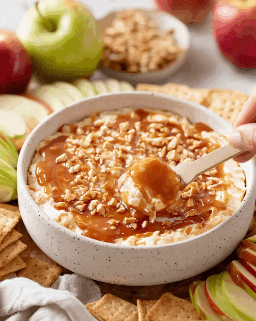 Cream Cheese Caramel Apple Dip is a quick, no-bake dessert featuring creamy cheese, rich caramel, and fresh apple slices — perfect for fall gatherings and holiday parties.