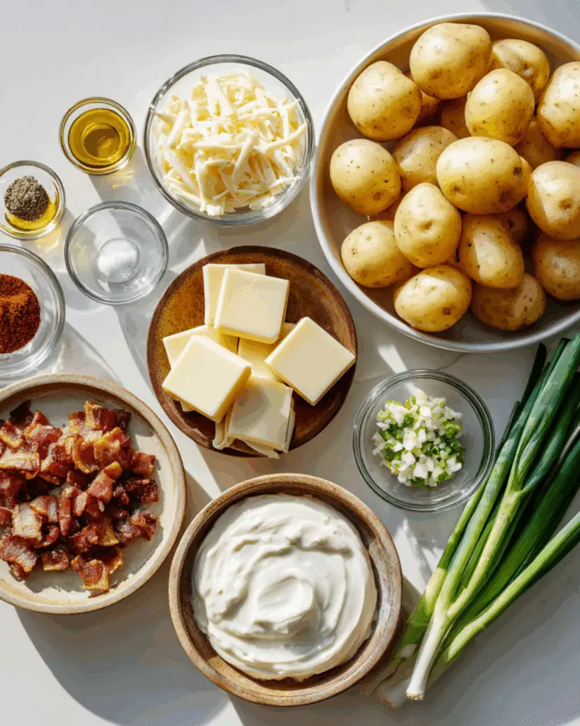 Tossing the potatoes in olive oil, Kosher salt, and freshly ground black pepper before roasting helps the skin crisp up and adds depth. For a flavor boost, try garlic powder, smoked paprika, or even a pinch of cayenne pepper. Just don’t go overboard—you want the toppings to shine.