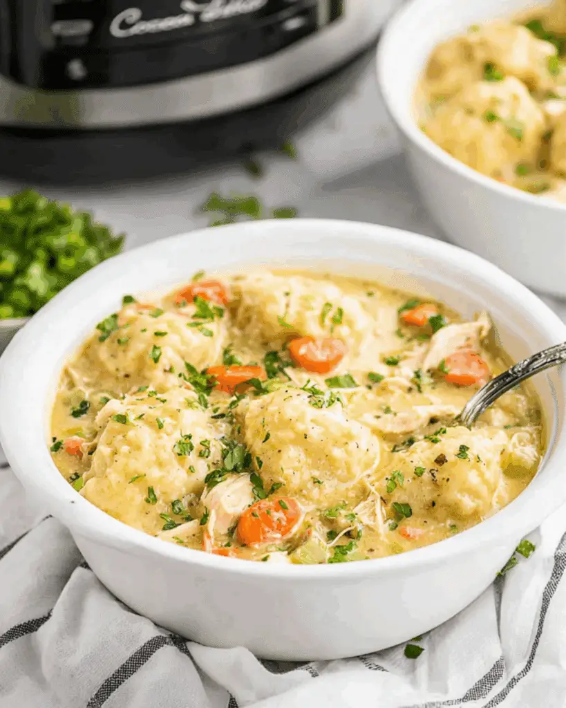 This Crockpot Chicken and Dumplings recipe is a cozy, creamy, and comforting slow cooker meal made with juicy chicken thighs, tender vegetables, and fluffy biscuit dumplings—all with minimal prep and maximum flavor.
