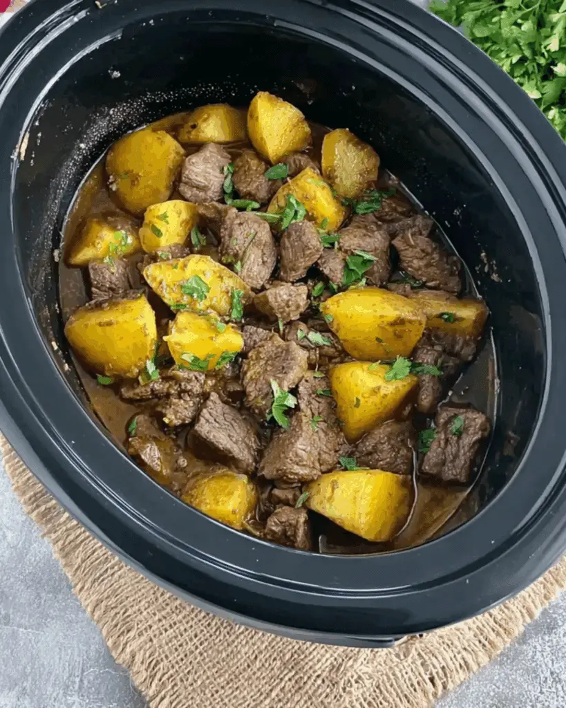 - Cook on LOW for 4–5 hours, until potatoes are tender and beef is fully cooked.