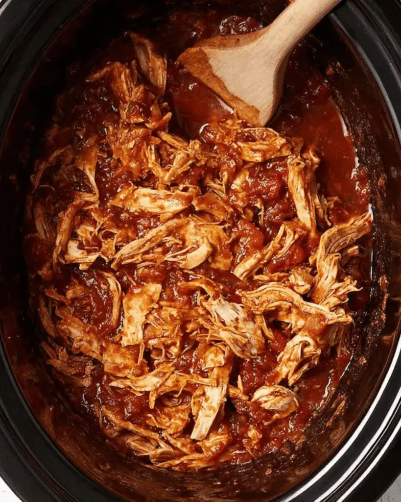 - Shred the chicken in the pot and mix with the salsa and juices.