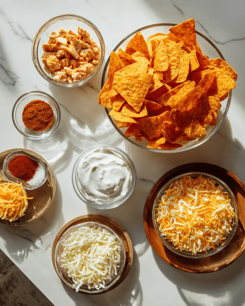 Start by preheating your oven to 350°F (175°C). While it heats, shred your cooked chicken, crush the Doritos slightly (not into crumbs), and mix up the creamy sauce. Spray your baking dish with non-stick spray for easy cleanup. Having everything prepped before assembly makes this process smooth and fast.