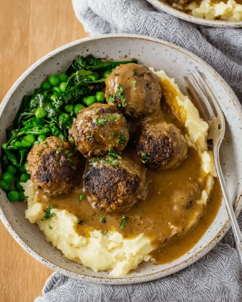 Round out your plate with simple sides that don’t compete with the flavor of the meatballs. Sautéed spinach and peas are quick and nutritious. Roasted carrots, green beans, or even a chopped kale salad work well, too. A lemony veggie side helps cut through the richness of the gravy and brings brightness to your plate.