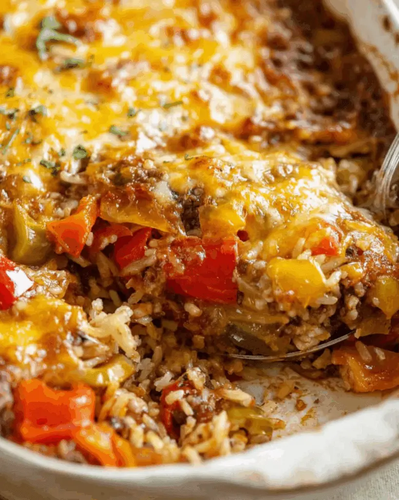 A hearty, cheesy one-pan casserole with ground beef, rice, bell peppers, and tomatoes—perfect for weeknights or meal prep.