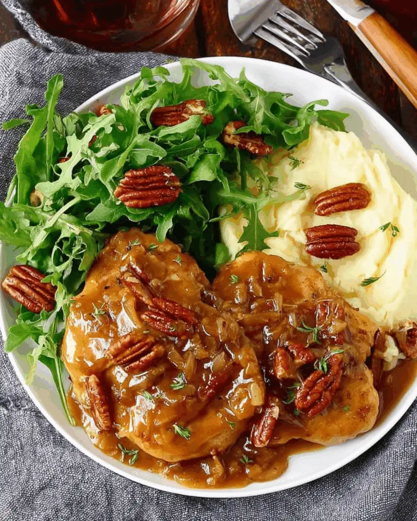 - Serve hot, spooning sauce and pecans over the chicken. Pair with mashed potatoes, roasted veggies, or salad.