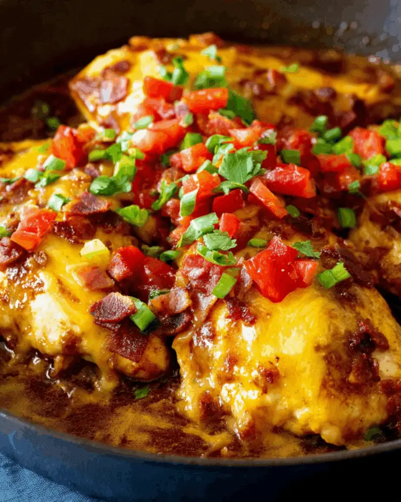 This Monterey Chicken recipe is a delicious skillet dinner made with juicy chicken breasts topped with BBQ sauce, melted Monterey Jack cheese, crispy bacon, and fresh garnishes. It’s a quick, bold, and flavorful dish perfect for weeknights or family dinners.