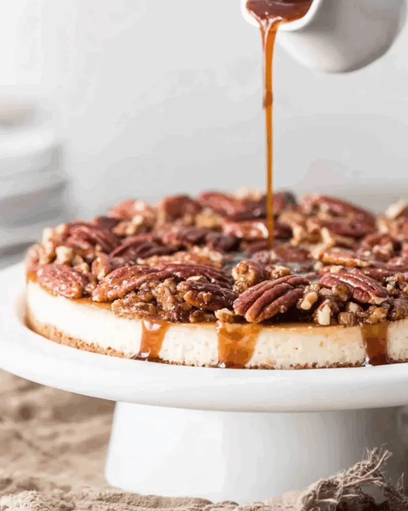 Right before serving, toss toasted pecan halves in warm caramel sauce until evenly coated. Spoon the pecans gently over the top of the cheesecake, covering as much or as little as you like. A final drizzle of caramel finishes the look.