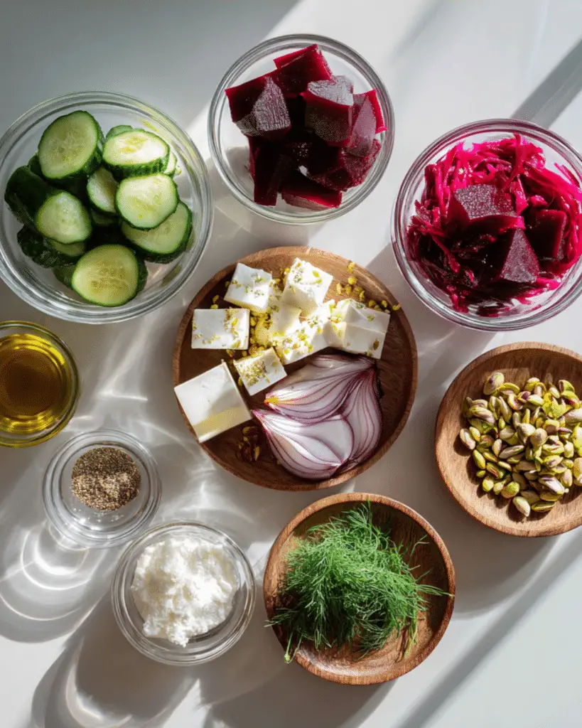 - Mix the Base: In a large bowl, combine chopped pickled beets, cucumbers, and thin red onion slices.