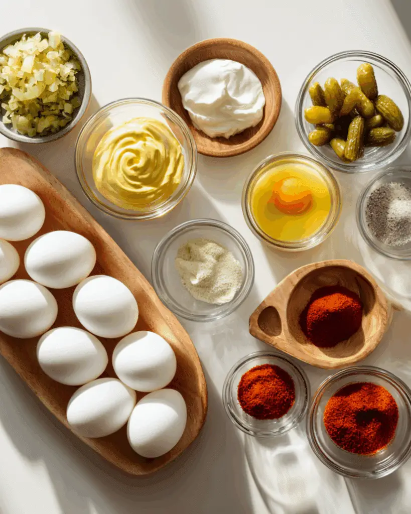 To make Pioneer Woman deviled eggs, you don’t need anything fancy—just simple pantry staples with a few flavorful twists. Here’s what goes into this standout recipe: