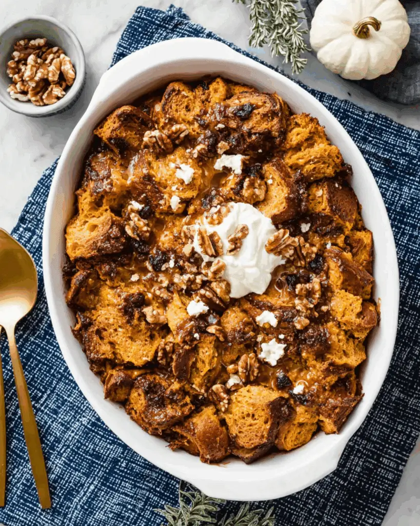 This dish brings together the best of fall: creamy pumpkin puree, cinnamon, nutmeg, and maple syrup, all soaked into fluffy challah bread. The result? A decadent, custard-like dessert that smells like a holiday and tastes like your favorite pumpkin pie—only better. It’s the kind of comfort food that makes guests ask for seconds (and the recipe).