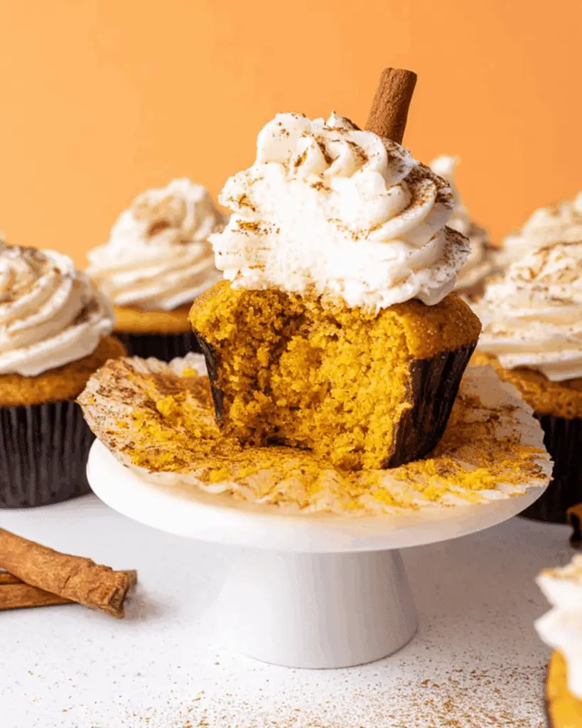 - Pipe frosting onto cooled cupcakes and garnish with pumpkin spice or cinnamon sticks if desired.