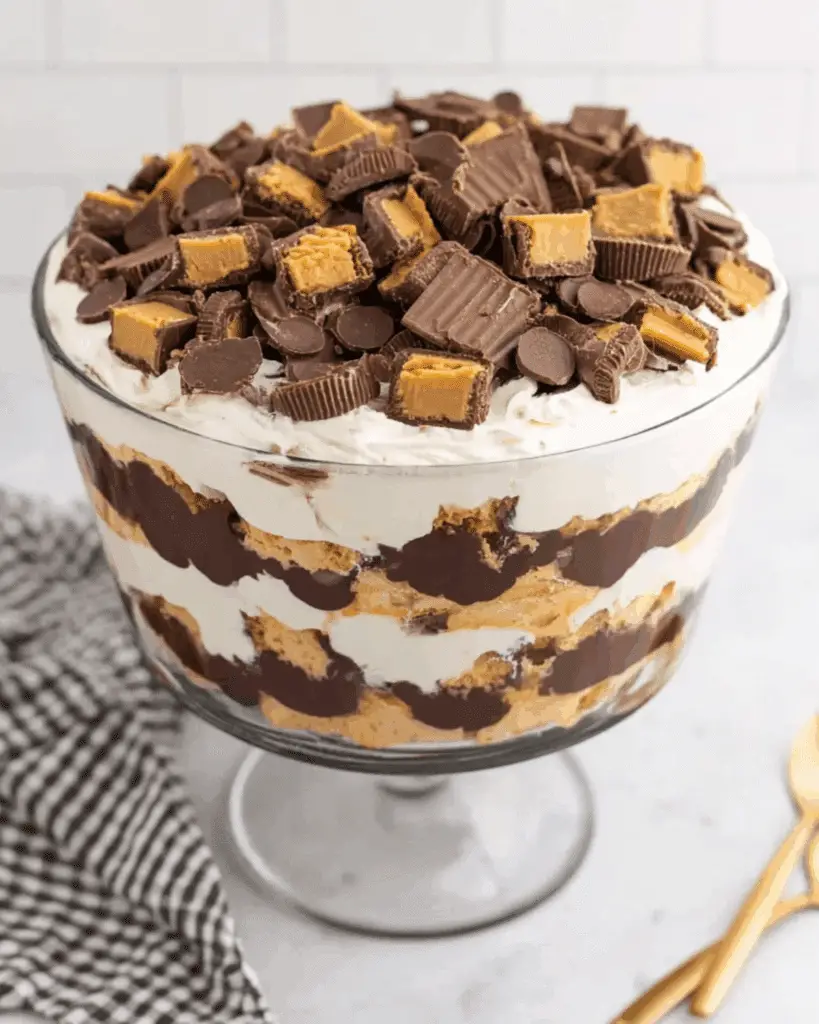 Reese’s Peanut Butter Trifle is a decadent, make-ahead layered dessert featuring brownies, creamy peanut butter pudding, Cool Whip, and chopped Reese’s Cups—perfect for parties and chocolate-peanut butter lovers.