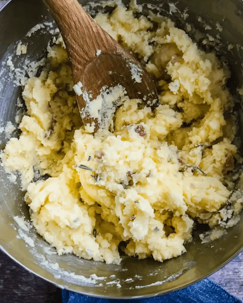 Once riced, gently fold in most of the infused butter, mashed roasted garlic, and heavy cream. Stir just until combined, seasoning with kosher salt and freshly cracked pepper to taste.