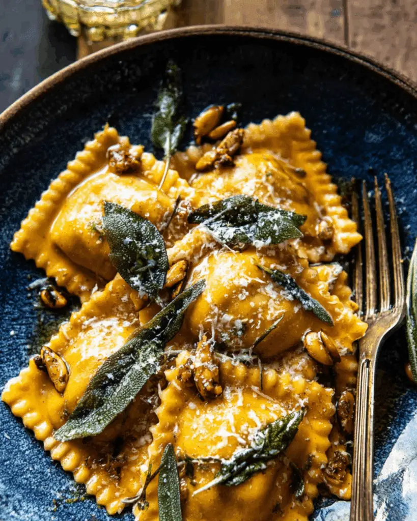 A cozy, fall-inspired dish made with pumpkin cheese ravioli tossed in a rich sage butter sauce, finished with crispy sage and nutty cheese—perfect for quick weeknight dinners or elegant weekend meals.