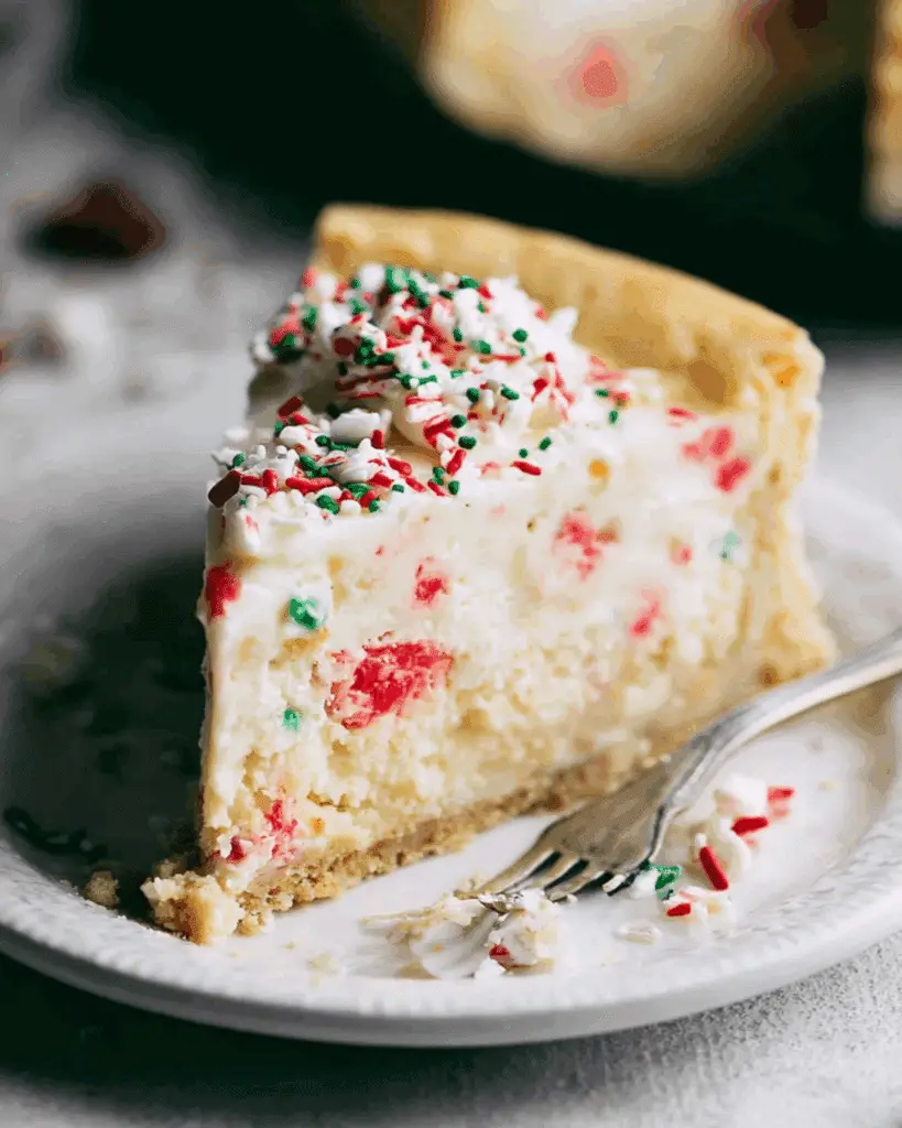 A rich and festive holiday dessert, Sugar Cookie Cheesecake features a buttery shortbread crust, creamy vanilla-almond filling, sprinkle-filled sugar cookie dough bites, and a tangy sour cream frosting.