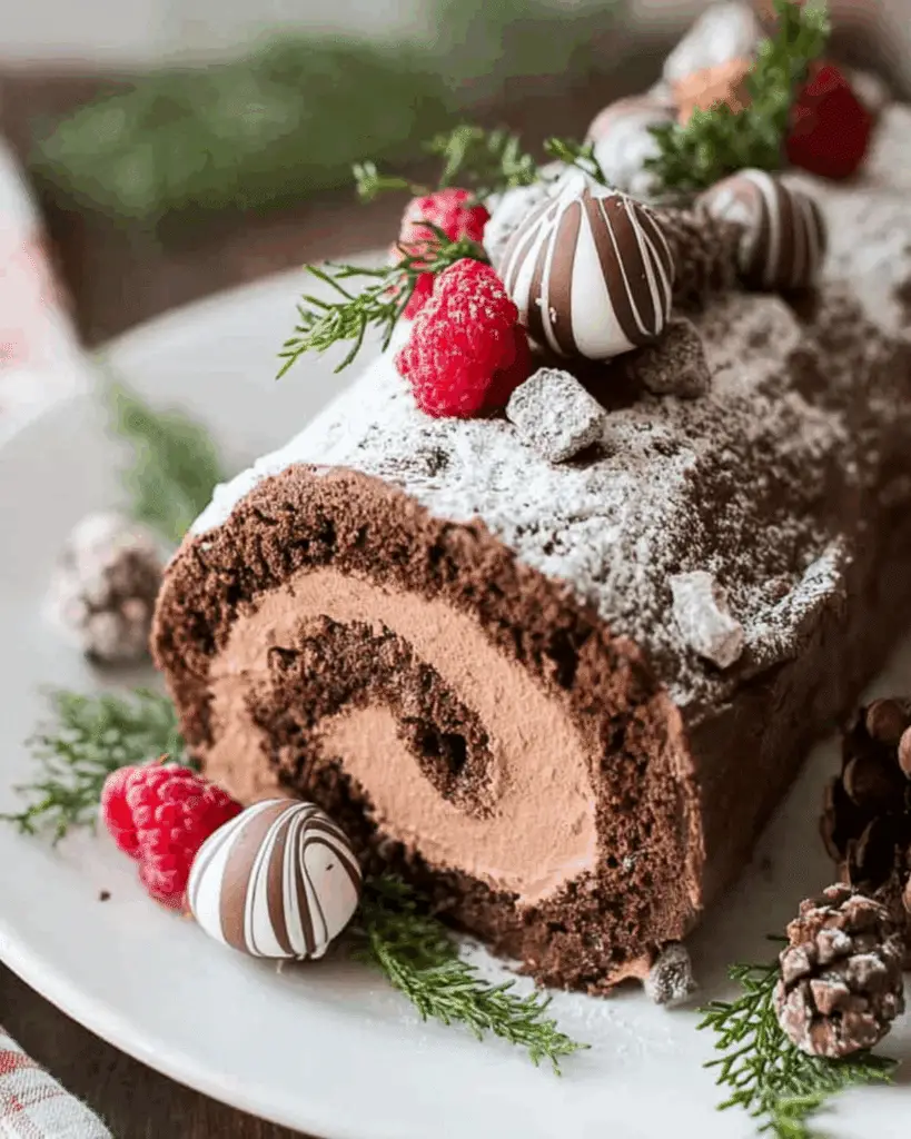 Meringue Mushrooms: These are adorable additions that take your log from great to unforgettable. Pipe domes and stems using stiff meringue, bake at 200°F until crisp, then glue pieces together with melted chocolate. Dust lightly with cocoa for realism.