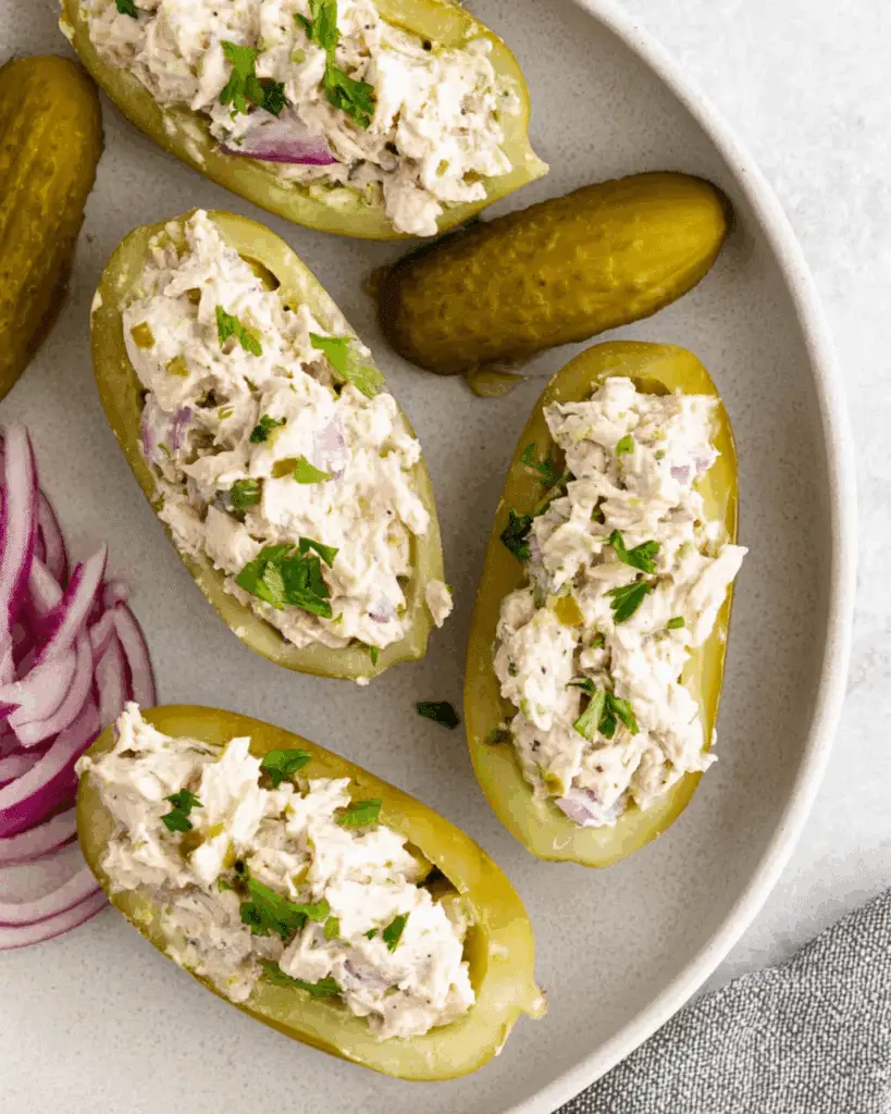 Popular among keto and low-carb eaters, tuna boats replace sandwich bread with crunchy pickles, reducing carbs while adding tang. Whether made with baby dills or full-sized pickles, they’re super customizable and easy to scale for parties or meal prep.