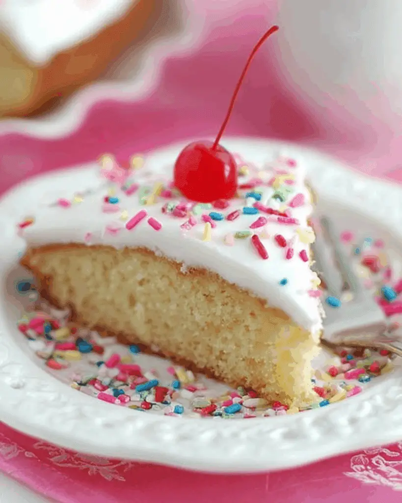 - Pour glaze over the cooled cake and spread evenly. Top with sprinkles and cherry if desired.