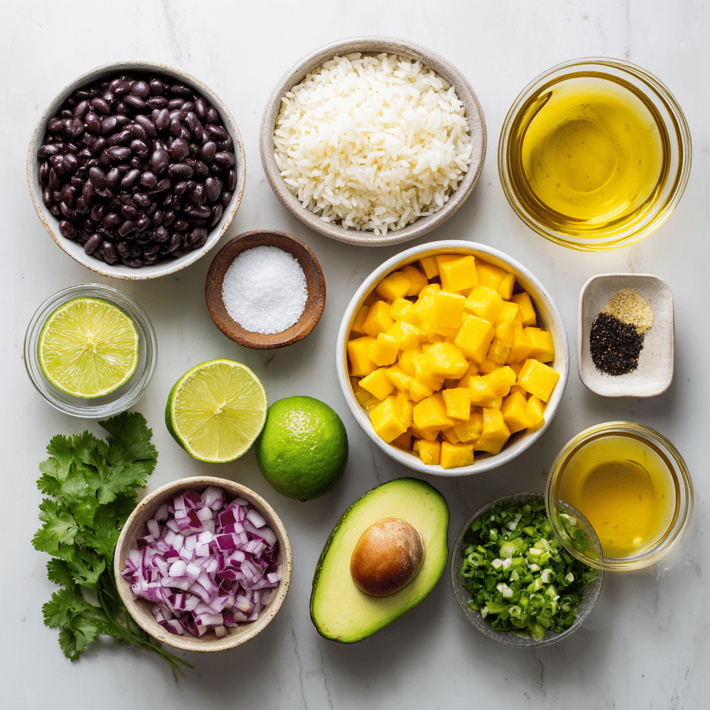 Ingredients for Vegan Mango Black Bean Green Rice Burrito Bowls